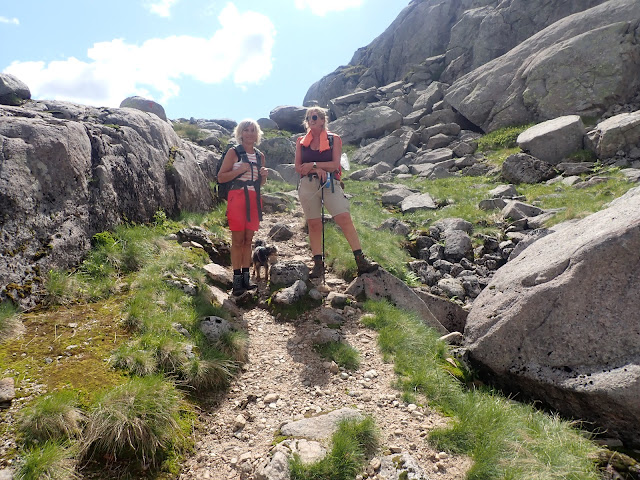 Det ble litt jobbing på vei tilbake til Hunnedalen. Stien mellom Blåfjellenden og Hunnedalen ble merket, men en av T-ene ble satt på en stor stein og viser vei like ut i myra. Her har mange gått feil, og det er tydelig sti – ut i myra.Det var meningen å male en pil på steinen som viser vei opp til høyre, men selvsagt glemte jeg malingen. Det ble til at jeg flyttet på noen små steiner med røde T-er, og på den måten bedre merket stien opp lia. Jeg håper det gjær at ikke filt så mange går feil her.